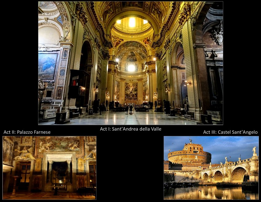 I have browsed through nine other complete productions, and arranged them in three groups. Those available on YouTube with English titles include a film from 1976 that also uses the actual Roman settings, like the one I showed but a little less crisp, and a production from Helsinki that has much simpler sets and no international stars, but may be the most dramatically gripping of all. Among the four without titles, the old Met version is valuable for its cast of Pavarotti, Verrett, and MacNeill, but it is quite old and faded. The others are pretty much straight productions from major houses with fine singers, in clear video with little to choose between them.