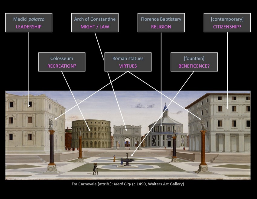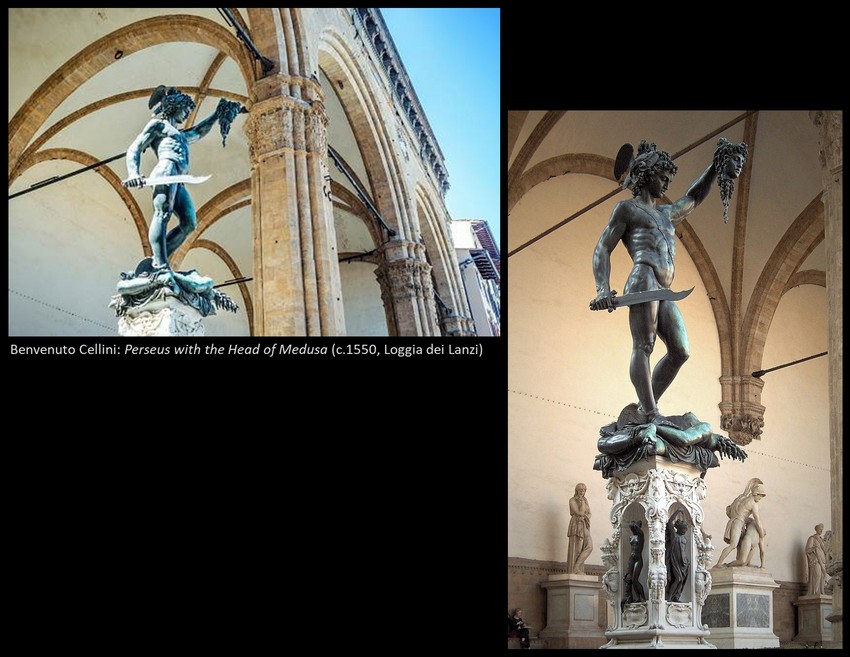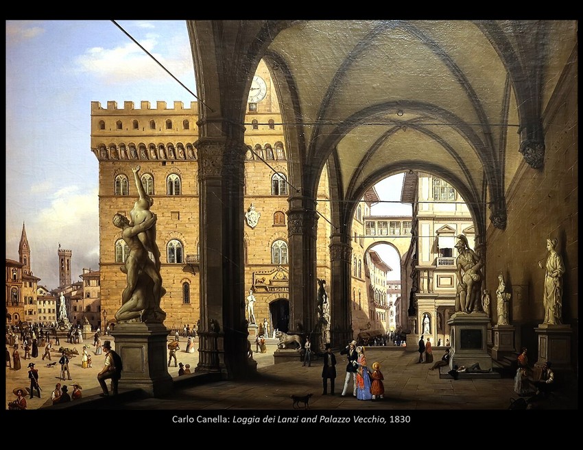 Yet walking around Florence today, one is surrounded by the medieval period as much as by the quattrocento. There was an earlier renaissance around 1300 that produced Dante, Giotto, and Petrarch, and many Florentine buildings are older still. Several of them became frames for public sculpture, and though much of it has been moved indoors to museums, much remains in place. The unique combination of art and setting made Florence a required stop on the Grand Tour for centuries, giving rise to a rich range of representation by outsiders, some of which we shall sample towards the end of the class. rb.